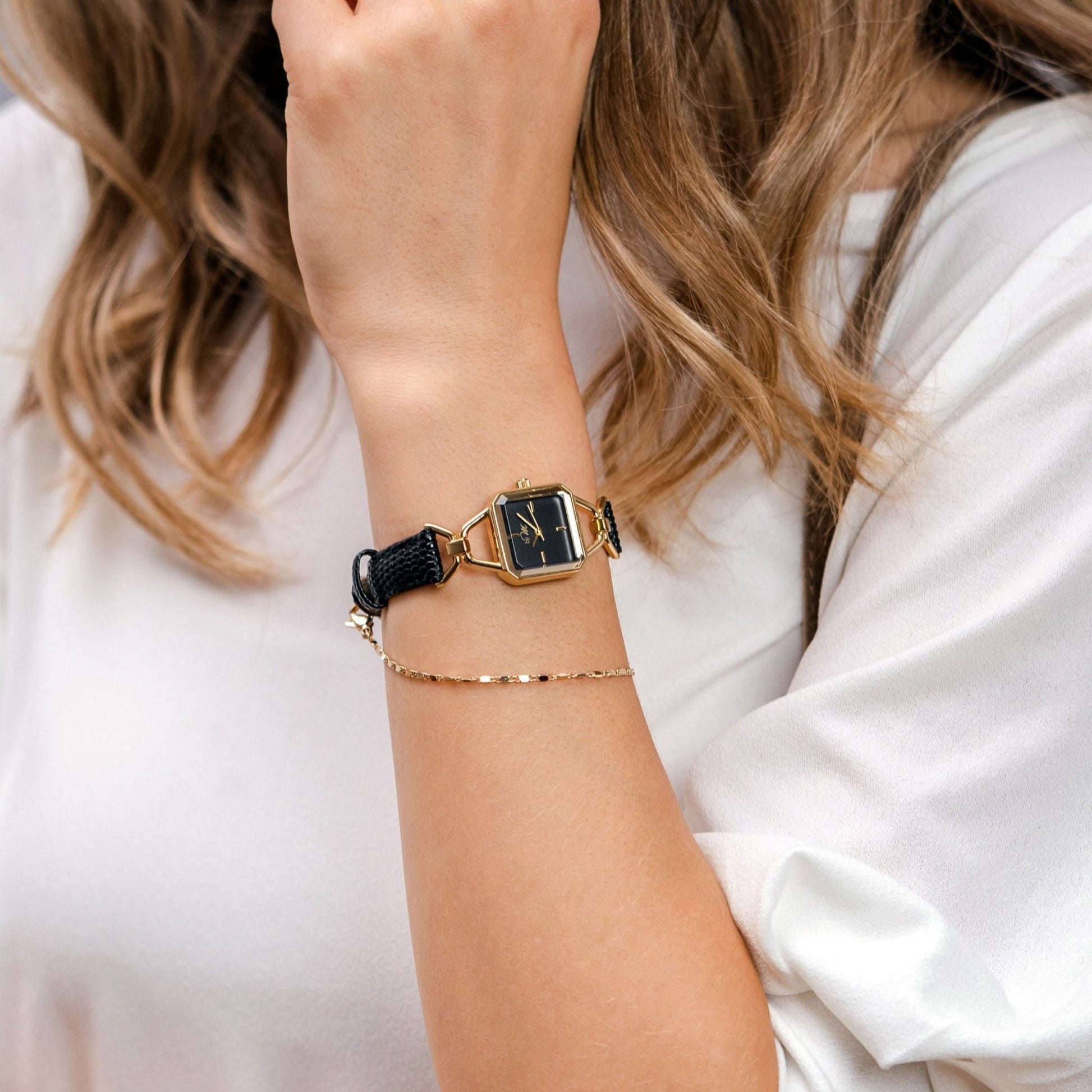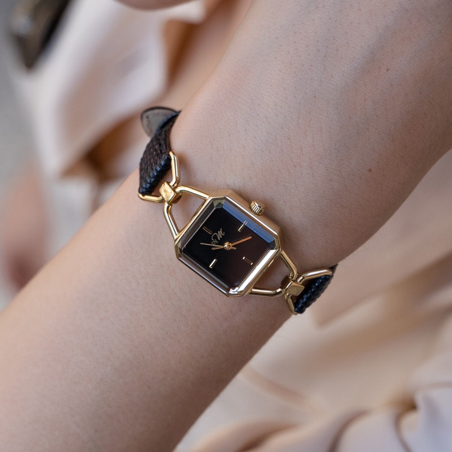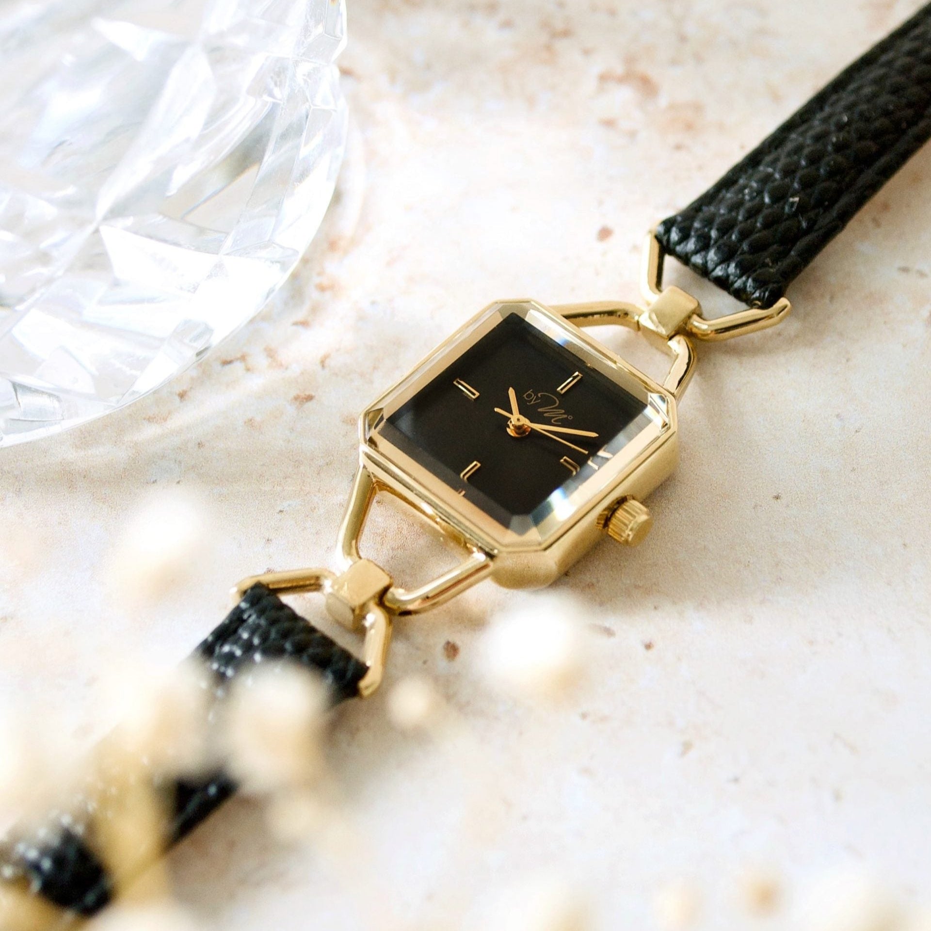 This luxurious watch has a clean and sophisticated look. The square watch dial features a minimalist design. If you look closely, the cut glass on the watch dial gives an added touch of style while the small watch face appears almost like a piece of jewelry. Wearing this piece will give you an eye-catching accessory that everyone will compliment. Ditch the big and bulky watches for this model which accentuates your elegance and femininity.