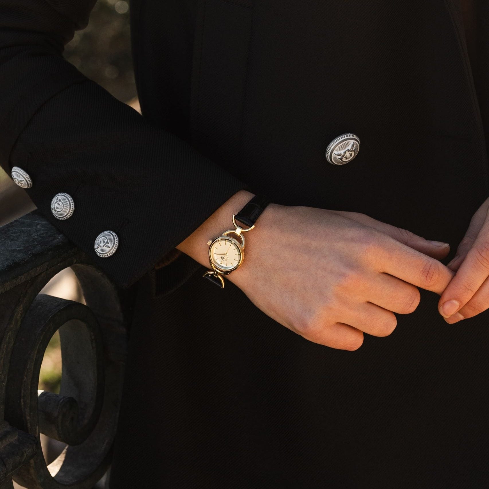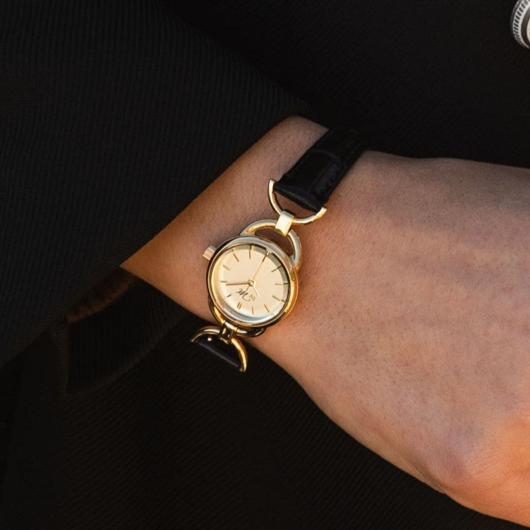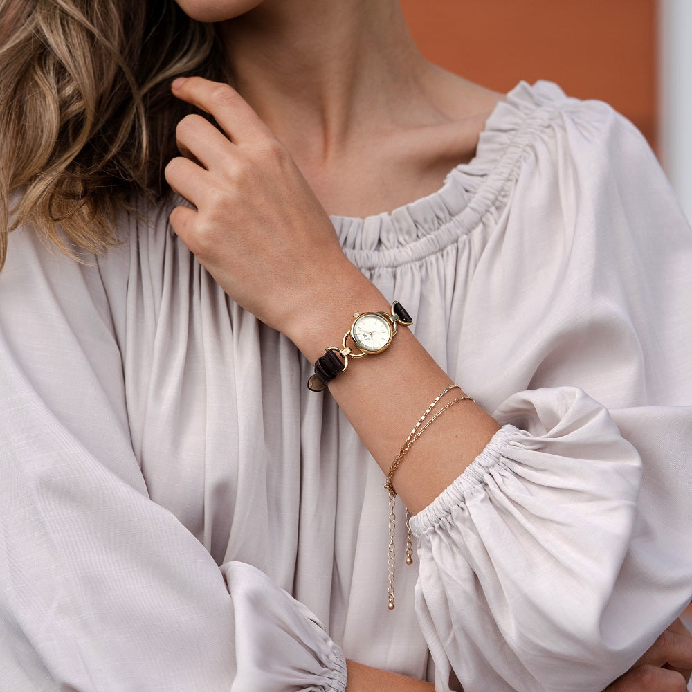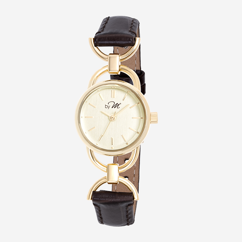 This vintage design watch features gold links and a minimalist circular dial, and a brown strap. The cut glass and petite watch face also make it appear like a piece of jewelry. The design behind the LINK collection is inspired by the 1980s. If you love versatile watches, this one provides a classic look that is fitting for all settings, including special occasions. The wrist strap features a crocodile texture and has a luxurious feel to it, which instantly accentuates your feminine sense of style.