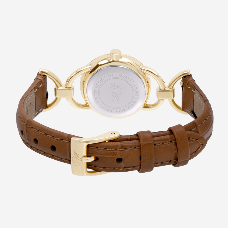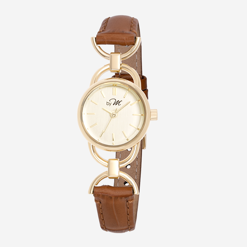 This vintage design watch features gold links and a minimalist circular dial, and a light brown strap. The cut glass and petite watch face also make it appear like a piece of jewelry. The design behind the LINK collection is inspired by the 1980s. If you love versatile watches, this one provides a classic look that is fitting for all settings, including special occasions. The wrist strap features a crocodile texture and has a luxurious feel to it, which instantly accentuates your feminine sense of style.
