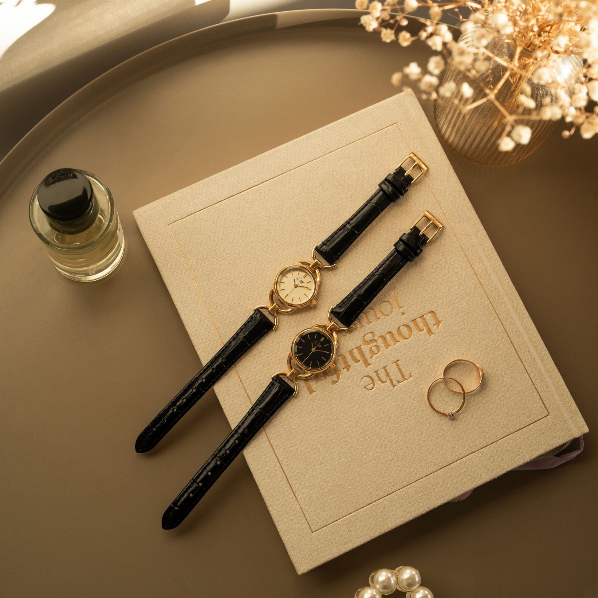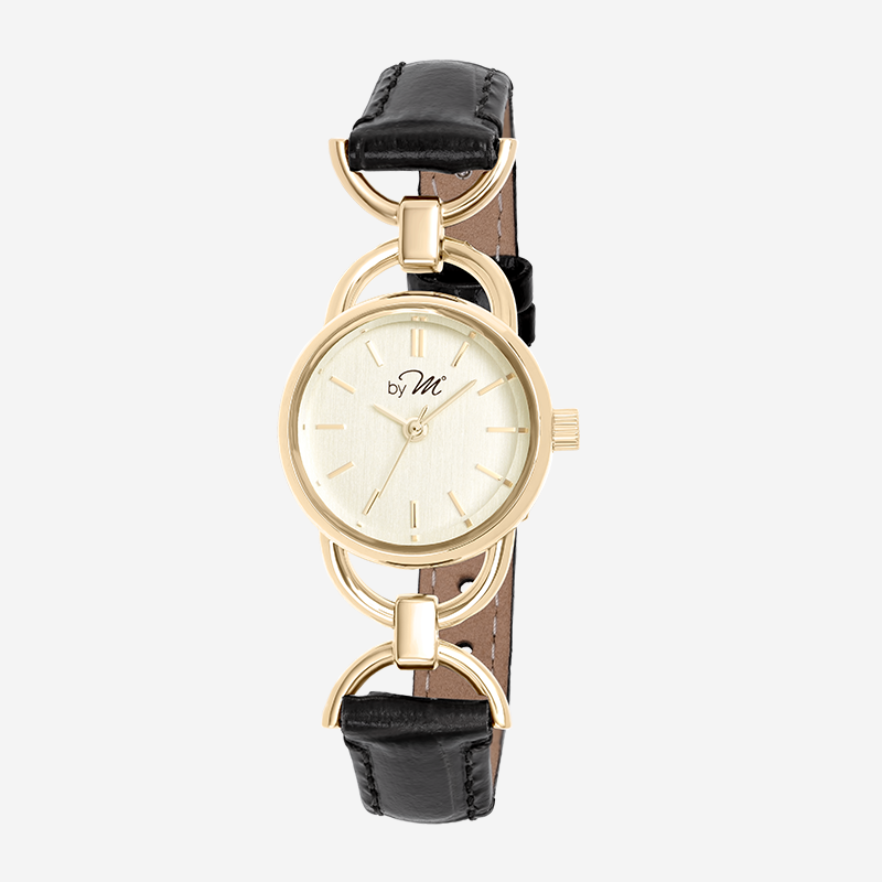 This vintage design watch features gold links and a minimalist circular dial, and a black strap. The cut glass and petite watch face also make it appear like a piece of jewelry. The design behind the LINK collection is inspired by the 1980s. If you love versatile watches, this one provides a classic look that is fitting for all settings, including special occasions. The wrist strap features a crocodile texture and has a luxurious feel to it, which instantly accentuates your feminine sense of style.