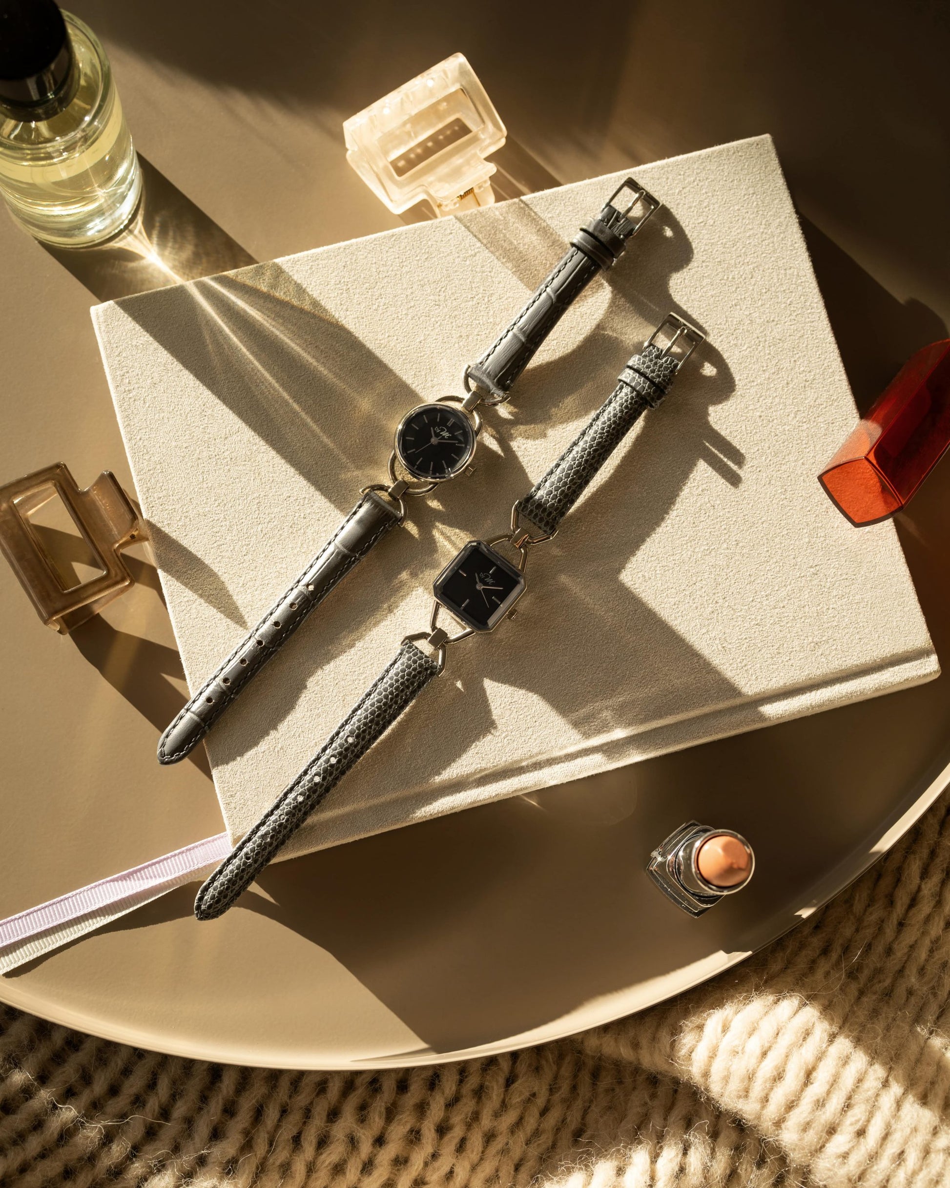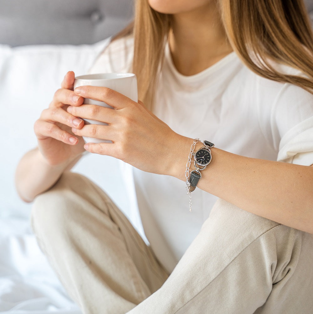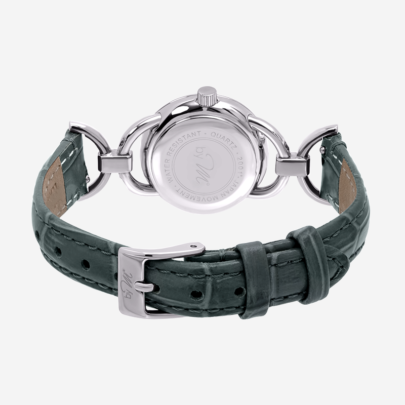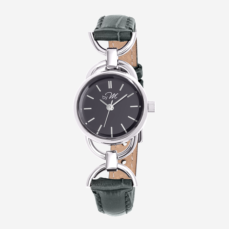 This vintage design watch features silver links and a minimalist circular dial, and a gray strap. The cut glass and petite watch face also make it appear like a piece of jewelry. The design behind the LINK collection is inspired by the 1980s. If you love versatile watches, this one provides a classic look that is fitting for all settings, including special occasions. The wrist strap features a crocodile texture and has a luxurious feel to it, which instantly accentuates your feminine sense of style.