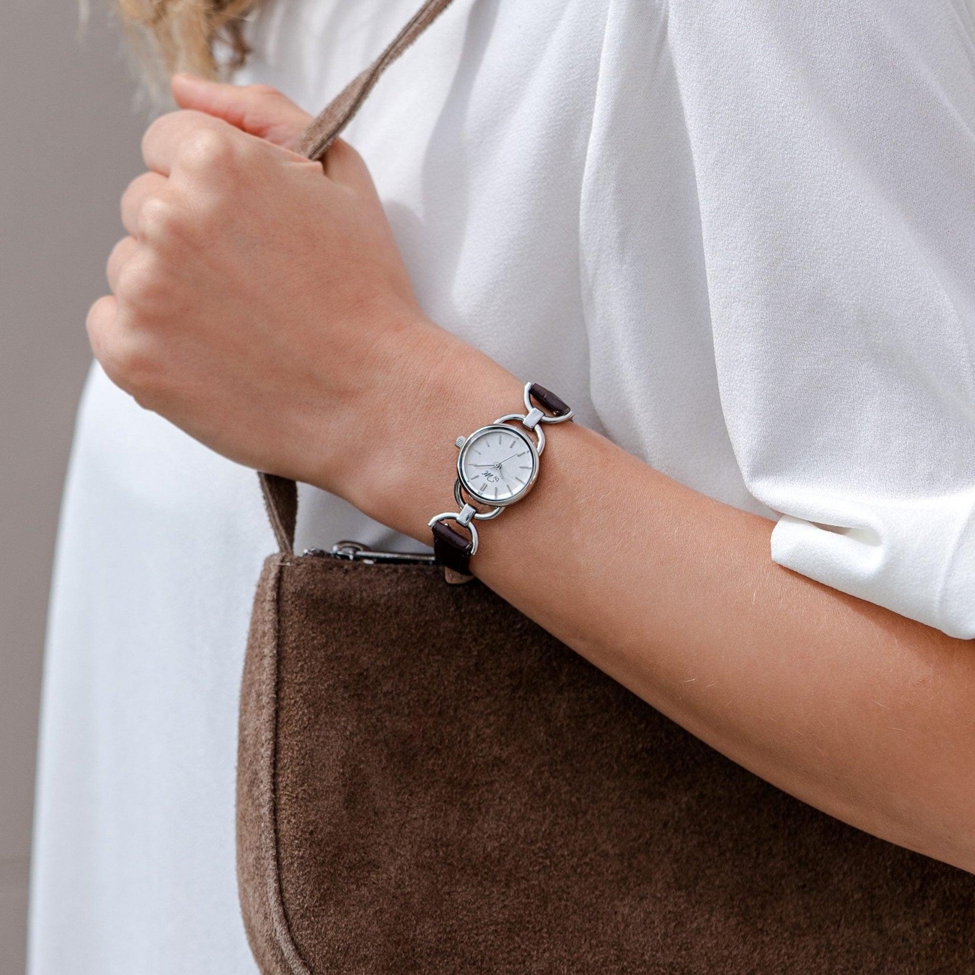 This luxurious watch has a clean and sophisticated look. The square watch dial features a minimalist design. If you look closely, the cut glass on the watch dial gives an added touch of style while the small watch face appears almost like a piece of jewelry. Wearing this piece will give you an eye-catching accessory that everyone will compliment. Ditch the big and bulky watches for this model which accentuates your elegance and femininity.