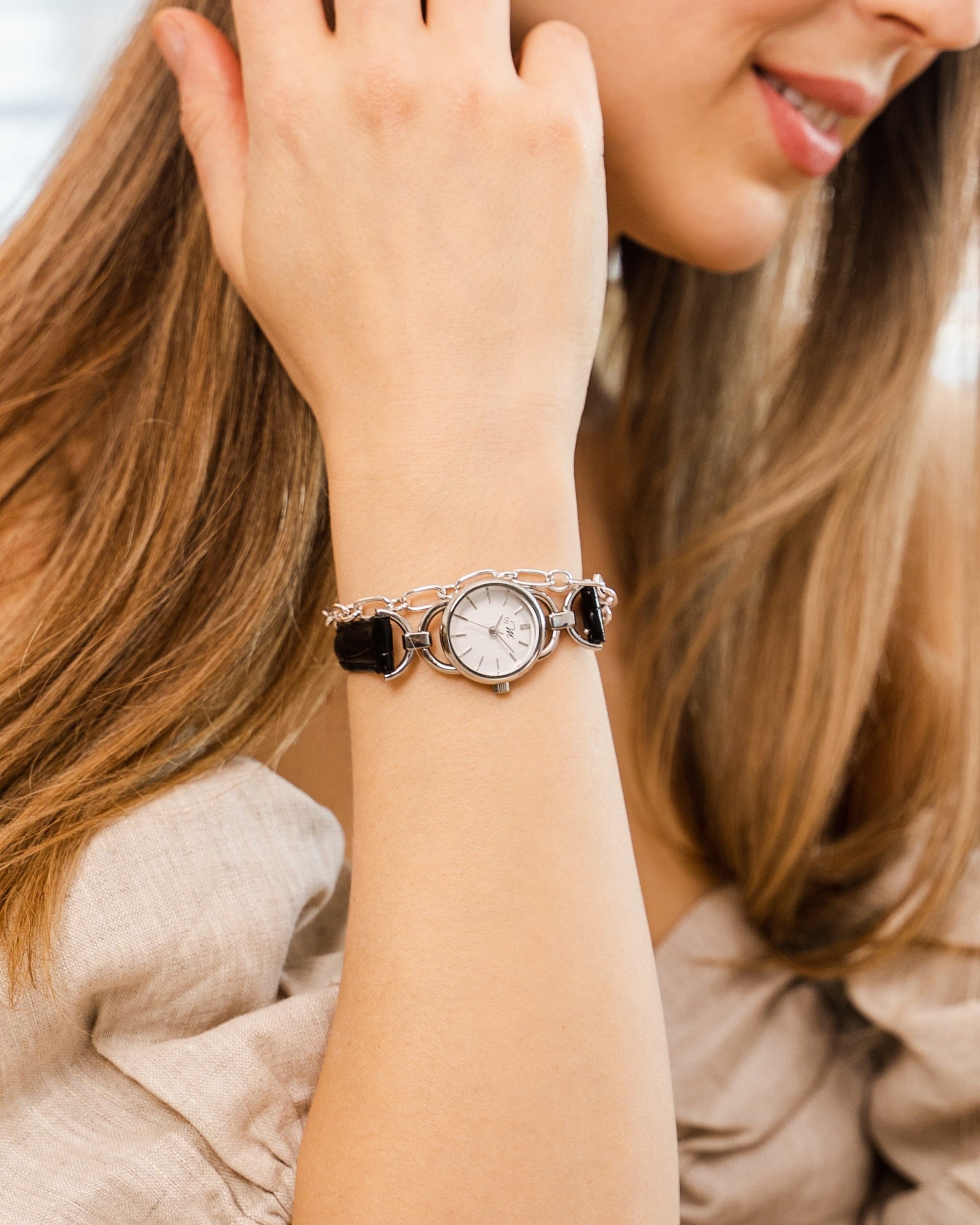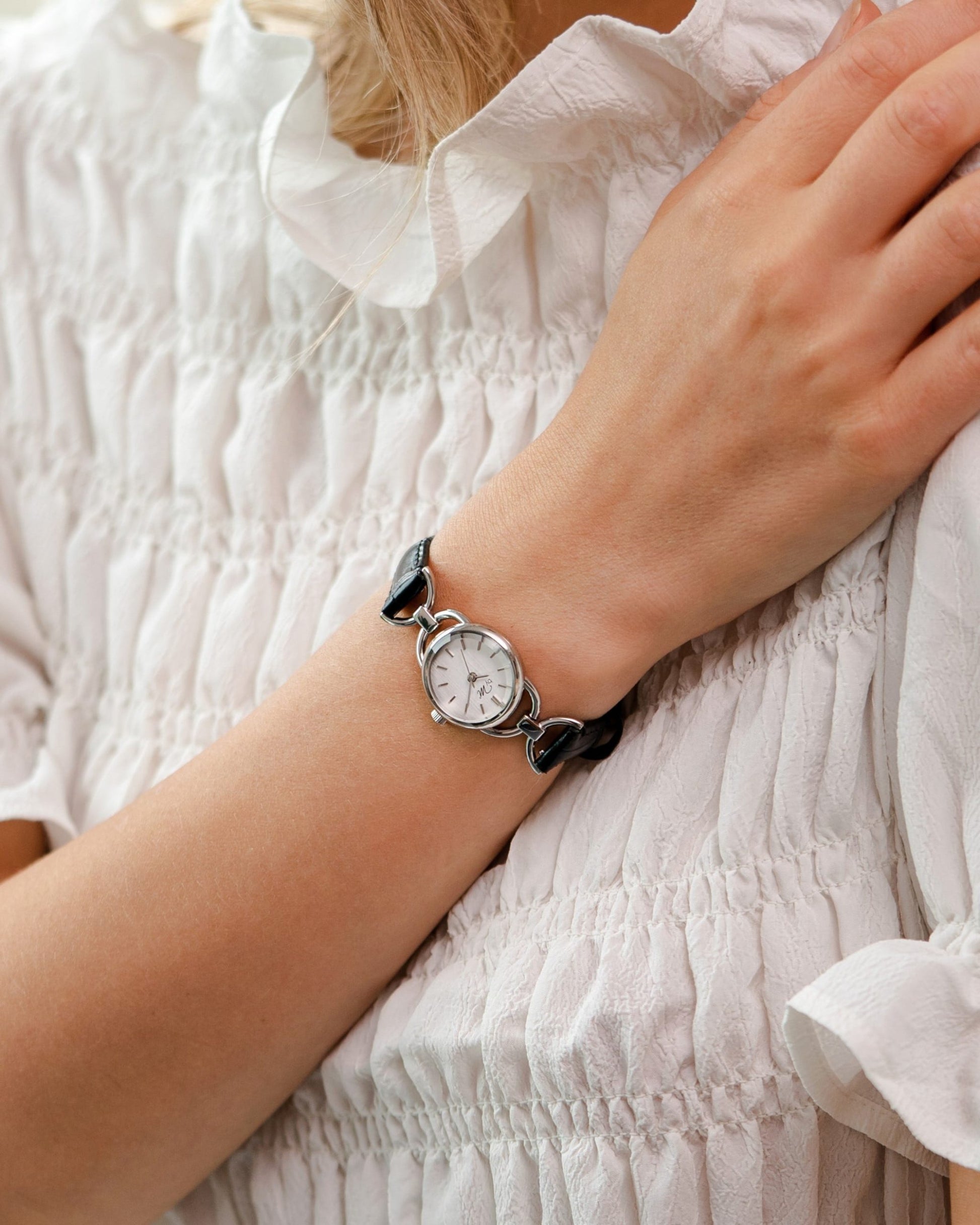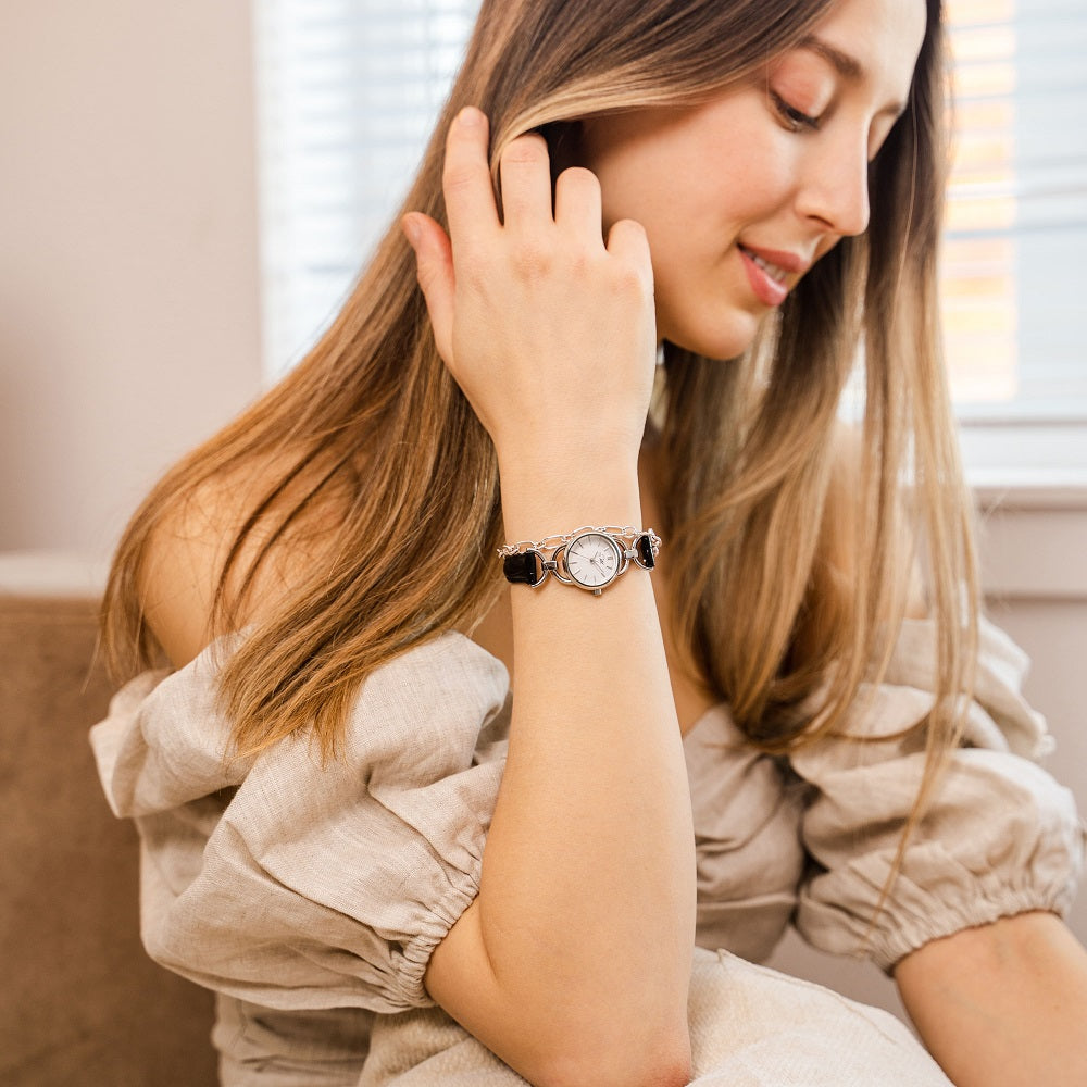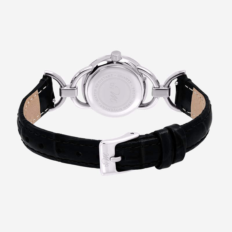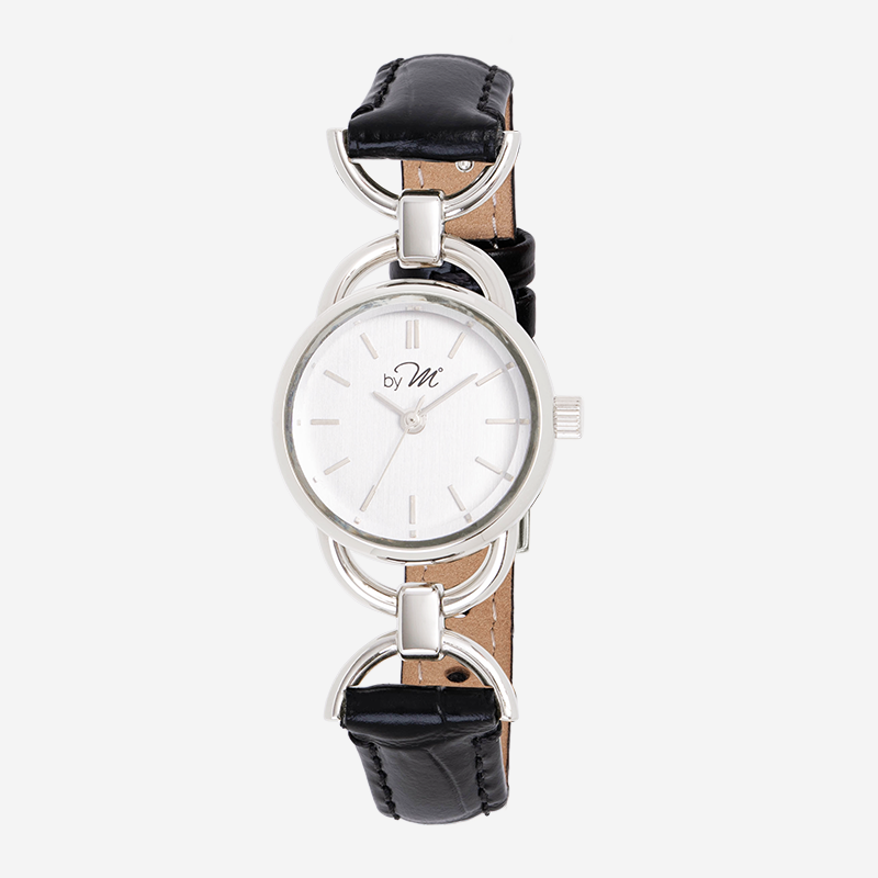 This vintage design watch features silver links and a minimalist circular dial, and a black strap. The cut glass and petite watch face also make it appear like a piece of jewelry. The design behind the LINK collection is inspired by the 1980s. If you love versatile watches, this one provides a classic look that is fitting for all settings, including special occasions. The wrist strap features a crocodile texture and has a luxurious feel to it, which instantly accentuates your feminine sense of style.